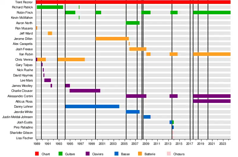 La composition du groupe a eu tendance à changer radicalement d'une tournée à l'autre : hormis Reznor, seul membre constant au chant, à la guitare, et aux claviers, aucun membre du groupe n'est resté depuis sa création. Reznor invoque entre autres la longue période de gestation entre les albums studio comme raison de ces changements de personnel.