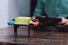 - La moto, où les Joy-Con sont placés de part et d'autre du guidon, permettant de contrôler cette dernière (Toy-Con compatible avec le jeu Mario Kart 8 Deluxe)[37] ;