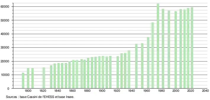 Avec le changement climatique, ces variables ont évolué. Une étude réalisée en 2014 par la Direction générale de l'Énergie et du Climat[14] complétée par des études régionales[15] prévoit en effet que la température moyenne devrait croître et la pluviométrie moyenne baisser, avec toutefois de fortes variations régionales. La station météorologique de Météo-France installée sur la commune et mise en service en 1958 permet de connaître en continu l'évolution des indicateurs météorologiques[16]. Le tableau détaillé pour la période 1981-2010 est présenté ci-après. La température moyenne annuelle évolue de 12,5 °C pour la période 1971-2000[17] à 12,5 °C pour 1981-2010[18], puis à 12,8 °C pour 1991-2020[19].