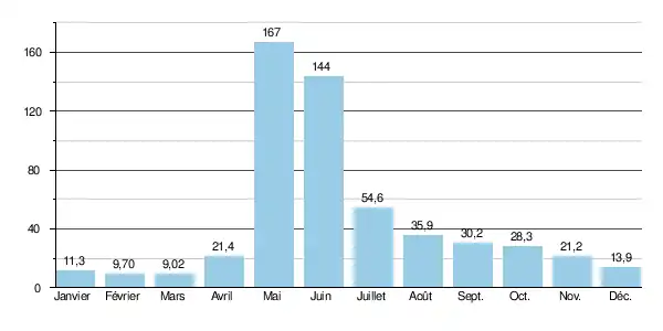 Le débit moyen mensuel observé en mars (minimum annuel d'étiage) se monte à 9,02 m3/s, ce qui représente 5,5 % du débit moyen du mois de mai (167 m3/s). L'amplitude des variations saisonnières peut être qualifiée d'assez élevée, mais correspond aux écarts constatés sur les autres cours d'eau de la région. Sur la période d'observation de 31 ans, le débit mensuel minimal a été de 5,67 m3/s en , tandis que le débit mensuel maximal s'est élevé à 252 m3/s en juin de la même année. Quant aux débits mensuels estivaux, c'est-à-dire observés durant la période libre de glaces (de juin à septembre), le minimum relevé a été de 12,3 m3/s en .