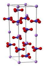 ![]() ![]() Formule développée et apparence du nitrate de lithium ![]() Structure cristalline : __ Li+ __ N __ O |