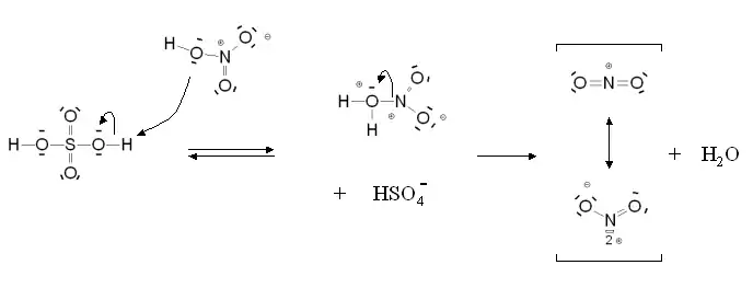Il intervient dans la réaction de nitration, notamment dans celle des composés aromatiques. On peut le mettre en évidence par spectroscopie dans les mélanges d'acide sulfonitrique selon la réaction suivante :