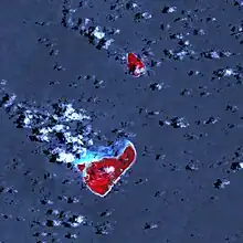 Image satellite (2001) de Niuatoputapu (en bas à gauche) et de Tafahi (en haut à droite), distantes de 6,5 km. | ||