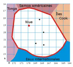 Niue[5] /nju.e/, Niué[6] ou encore Nioué[7] (en anglais Niue[5], en niuéen Niuē) est un pays insulaire de l'océan Pacifique sud, en Polynésie occidentale. Il est situé à 2 400 km au nord-est de la Nouvelle-Zélande, au centre d'un triangle formé par les îles Tonga, Samoa et Cook.
