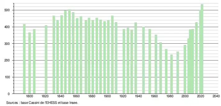 L'évolution du nombre d'habitants est connue à travers les recensements de la population effectués dans la commune depuis 1793. Pour les communes de moins de 10 000 habitants, une enquête de recensement portant sur toute la population est réalisée tous les cinq ans, les populations légales des années intermédiaires étant quant à elles estimées par interpolation ou extrapolation[23]. Pour la commune, le premier recensement exhaustif entrant dans le cadre du nouveau dispositif a été réalisé en 2004[24].