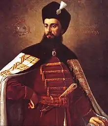 En Valachie (en roumain : principatul Țării Românești), la souveraineté fut exercée de 1330 à 1859 par un prince valaque (roumain : Domnul Țării Românești, en français voïvode ou hospodar de Valachie) tributaire de l'Empire ottoman depuis 1394. En 1859 elle s'unit à la Moldavie pour devenir la principauté de Roumanie. Après avoir été élu par le sfat domnesc (« conseil princier ») le souverain de Valachie était confirmé par la Sublime Porte, sur ordre du sultan de l'Empire ottoman à Constantinople. Les mœurs et les usages de la noblesse valaque différaient de ceux du peuple. La noblesse valaque était fort nombreuse et se divisait en trois classes assez distinctes, mais aussi fort « poreuses » entre elles au fil des alliances et des aléas de fortune économique ou politique : la « première classe » (rândul crăiesc, littéralement « rang princier ») comptait les familles souveraines, qui avaient régné sur le trône de la principauté (successivement à Curtea de Argeș au XIVe siècle, à Târgoviște au XVe siècle et à Bucarest depuis le XVIIe siècle) ; la « seconde classe » (rândul curtean, littéralement « rang courtisan ») qui, sans avoir régné, occupait néanmoins de hauts rangs et charges, possédait de grands domaines latifundiaires et de grandes richesses, était non seulement exempte de toute contribution mais pouvait en percevoir, et comptait en outre les nouveaux nobles adoubés par les princes ; et la « troisième classe » (rândul moșnean, littéralement « rang terrien »), de loin la plus nombreuse, qui se composait de familles ayant quelques terres, offices et privilèges, qui les exemptaient de certaines taxes ou impôts[26],[27].