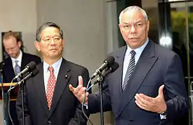 Il est ensuite ministre des Affaires étrangères des 88e et 89e Cabinets du Japon, à savoir les deuxièmes et troisièmes dirigés par Jun'ichirō Koizumi, du au . Il doit essentiellement faire face alors à des relations sino-japonaises au plus bas, notamment du fait de la controverse concernant des manuels d'histoire japonais minimisant certains crimes de guerre commis durant la Seconde guerre sino-japonaise dont notamment le massacre de Nankin, provoquant de violentes manifestations anti-japonaises en Chine en 2005[6]. Tout en demandant alors des excuses au gouvernement chinois pour les violences commises par certains manifestants contre des commerces ou représentations japonaises à Pékin[7], il s'est immédiatement rendu sur place afin de calmer la situation et de réchauffer les relations entre les deux pays[8].