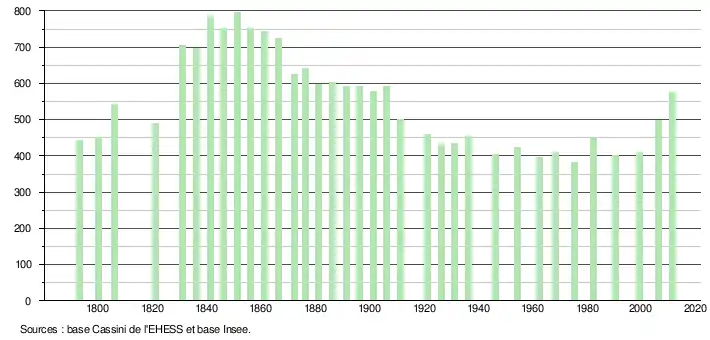 L'évolution du nombre d'habitants est connue à travers les recensements de la population effectués dans la commune depuis 1793. À partir du , les populations légales des communes sont publiées annuellement dans le cadre d'un recensement qui repose désormais sur une collecte d'information annuelle, concernant successivement tous les territoires communaux au cours d'une période de cinq ans. Pour les communes de moins de 10 000 habitants, une enquête de recensement portant sur toute la population est réalisée tous les cinq ans, les populations légales des années intermédiaires étant quant à elles estimées par interpolation ou extrapolation[5]. Pour la commune, le premier recensement exhaustif entrant dans le cadre du nouveau dispositif a été réalisé en 2006[6],[Note 1].