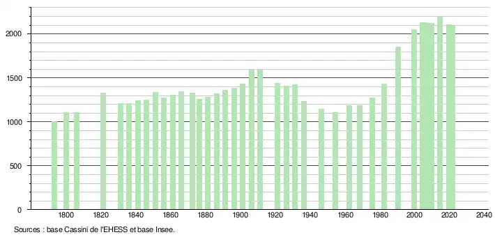 L'évolution du nombre d'habitants est connue à travers les recensements de la population effectués dans la commune depuis 1793. Pour les communes de moins de 10 000 habitants, une enquête de recensement portant sur toute la population est réalisée tous les cinq ans, les populations légales des années intermédiaires étant quant à elles estimées par interpolation ou extrapolation[28]. Pour la commune, le premier recensement exhaustif entrant dans le cadre du nouveau dispositif a été réalisé en 2004[29].