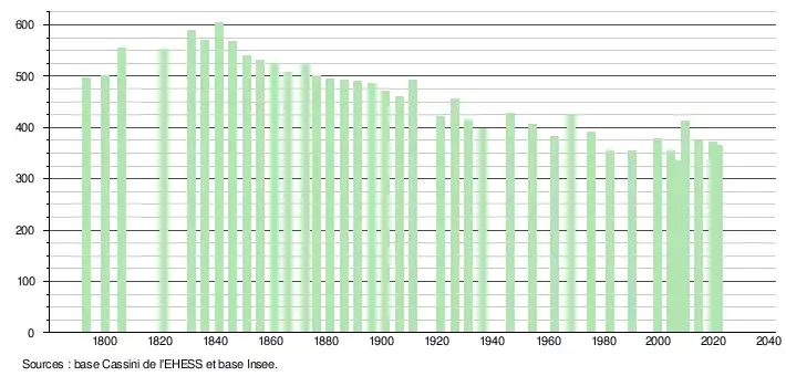 L'évolution du nombre d'habitants est connue à travers les recensements de la population effectués dans la commune depuis 1793. Pour les communes de moins de 10 000 habitants, une enquête de recensement portant sur toute la population est réalisée tous les cinq ans, les populations légales des années intermédiaires étant quant à elles estimées par interpolation ou extrapolation[18]. Pour la commune, le premier recensement exhaustif entrant dans le cadre du nouveau dispositif a été réalisé en 2004[19].