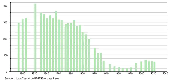L'évolution du nombre d'habitants est connue à travers les recensements de la population effectués dans la commune depuis 1793. Pour les communes de moins de 10 000 habitants, une enquête de recensement portant sur toute la population est réalisée tous les cinq ans, les populations légales des années intermédiaires étant quant à elles estimées par interpolation ou extrapolation[45]. Pour la commune, le premier recensement exhaustif entrant dans le cadre du nouveau dispositif a été réalisé en 2007[46].