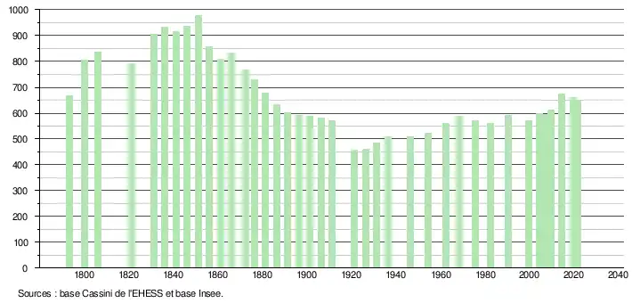 L'évolution du nombre d'habitants est connue à travers les recensements de la population effectués dans la commune depuis 1793. Pour les communes de moins de 10 000 habitants, une enquête de recensement portant sur toute la population est réalisée tous les cinq ans, les populations légales des années intermédiaires étant quant à elles estimées par interpolation ou extrapolation[19]. Pour la commune, le premier recensement exhaustif entrant dans le cadre du nouveau dispositif a été réalisé en 2004[20].