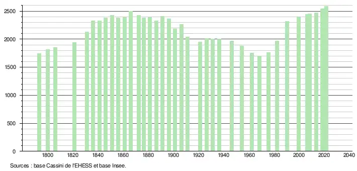 L'évolution du nombre d'habitants est connue à travers les recensements de la population effectués dans la commune depuis 1793. Pour les communes de moins de 10 000 habitants, une enquête de recensement portant sur toute la population est réalisée tous les cinq ans, les populations légales des années intermédiaires étant quant à elles estimées par interpolation ou extrapolation[35]. Pour la commune, le premier recensement exhaustif entrant dans le cadre du nouveau dispositif a été réalisé en 2008[36].