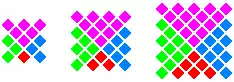 - La dernière égalité est représentée ci-dessous pour n = 1, 2, 3, et 4 ; la n-ième figure est formée en considérant un carré de 2n – 1 points par 2n – 1 points, et en sélectionnant la moitié des points : à partir du coin supérieur gauche, jusqu'au point central inclus.[réf. souhaitée]