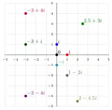 En mathématiques, l'ensemble des nombres complexes est actuellement défini comme une extension de l'ensemble des nombres réels, contenant en particulier un nombre imaginaire noté i[alpha 1],[alpha 2] tel que i2 = −1. Le carré de (−i) est aussi égal à −1 : (−i)2 = −1. Tout nombre complexe peut s'écrire sous la forme x + i y où x et y sont des nombres réels.