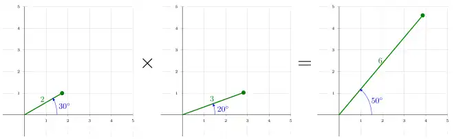 Considérons 2+3i. Multiplier par 2 ce nombre consiste à doubler le vecteur partant de l'origine finissant au point d’abscisse 2 et d'ordonnée 3. On obtient le nombre complexe 4+6i. Bref, multiplier par un nombre réel revient à allonger/rétrécir/changer de sens le vecteur associé au point. Multiplier par un nombre complexe est plus subtil. Cela revient non seulement à allonger/rétrécir le vecteur mais aussi à le pivoter, en additionnant les angles[pas clair]. Plus précisément, pour chaque nombre complexe (i.e. un point du plan), on considère l'angle entre l'axe des abscisses et le vecteur correspondant à la flèche partant de l'origine finissant en ce point. L'exemple ci-dessous considère deux nombres complexes. L'un est obtenu en avançant d'une distance de 2 avec un angle de 30°, et l'autre en avançant de 3 avec un angle de 20°. Le produit de ces deux nombres est le point obtenu en avançant de 6 (2 fois 3) avec un angle de 50° (20° + 30°).