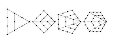La méthode pour passer d'un polygone au suivant consiste à prolonger d'un seul point chacun des deux côtés adjacents à un seul sommet, puis à compléter la figure par des points pour obtenir les côtés supplémentaires manquants. Dans les diagrammes ci-dessous, chaque couche supplémentaire est représentée par des points rouges. Pour tout entier k ≥ 3, par convention, posons Pk,0 = 0 ; pour tout entier n ≥ 1, le nombre de points rouges du n-ième k-gone, possédant points sur chaque arête, est égal à (points disposés aux sommets) plus (points disposés à l'intérieur des arêtes). Donc :