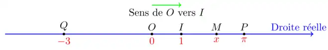 On considère une droite D contenant un point O que l'on appellera, par convention, origine. Soit un point I distinct de O appartenant à D que l'on identifie au nombre 1. Par convention, on dira que la distance de O à I est égale à 1 et que l'orientation de la droite est celle de O vers I. À tout point M de la droite, on associe la distance entre O et M. Si M et I sont du même côté par rapport à O alors la distance est comptée positivement, sinon elle est négative.