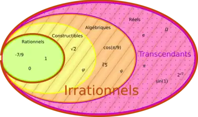 Bien que tous ces sous-ensembles des réels soient de cardinal infini, ils sont tous dénombrables et ne représentent donc qu'une infime partie de l'ensemble des réels. Ils ont chacun des propriétés propres. Deux sont particulièrement étudiés par les mathématiciens : les nombres rationnels et les nombres algébriques ; on appelle « irrationnels » les réels qui ne sont pas rationnels et « transcendants » ceux qui ne sont pas algébriques.