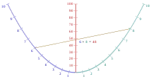 La parabole ci-contre est doublement cotée, ce qui signifie qu’on considère comme séparées les deux moitiés de celle-ci, graduées respectivement en bleu et en cyan. L'axe de la parabole, en rouge, est également gradué, mais les graduations ne vont plus jusqu'à 10 comme sur les deux branches latérales, mais jusqu'à 100.