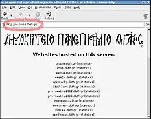 | .δοκιμή | .dokimé | .xn--jxalpdlp | Grec | Alphabet grec | « http://παράδειγμα.δοκιμή/ »(Archive.org • Wikiwix • Archive.is • Google • Que faire ?) (consulté le ) |