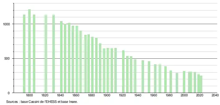 L'évolution du nombre d'habitants est connue à travers les recensements de la population effectués dans la commune depuis 1793. Pour les communes de moins de 10 000 habitants, une enquête de recensement portant sur toute la population est réalisée tous les cinq ans, les populations légales des années intermédiaires étant quant à elles estimées par interpolation ou extrapolation[33]. Pour la commune, le premier recensement exhaustif entrant dans le cadre du nouveau dispositif a été réalisé en 2008[34].