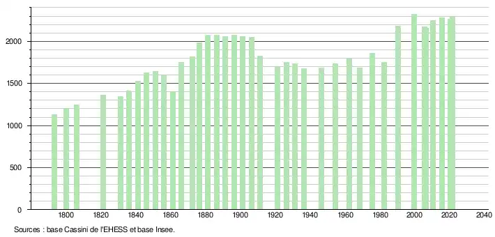 L'évolution du nombre d'habitants est connue à travers les recensements de la population effectués dans la commune depuis 1793. Pour les communes de moins de 10 000 habitants, une enquête de recensement portant sur toute la population est réalisée tous les cinq ans, les populations légales des années intermédiaires étant quant à elles estimées par interpolation ou extrapolation[39]. Pour la commune, le premier recensement exhaustif entrant dans le cadre du nouveau dispositif a été réalisé en 2005[40].