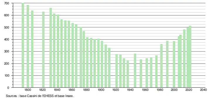 L'évolution du nombre d'habitants est connue à travers les recensements de la population effectués dans la commune depuis 1793. Pour les communes de moins de 10 000 habitants, une enquête de recensement portant sur toute la population est réalisée tous les cinq ans, les populations légales des années intermédiaires étant quant à elles estimées par interpolation ou extrapolation[25]. Pour la commune, le premier recensement exhaustif entrant dans le cadre du nouveau dispositif a été réalisé en 2008[26].