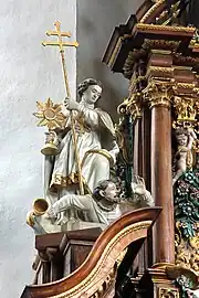 Norbert combattant Tanchelm, statue sur un autel latéral de l'église paroissiale de Wehr (Eifel).