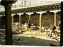 Le 14e dalaï-lama, à l'âge de 14 ans, fit construire une salle de projection dans l'enceinte de son palais pendant l'hiver 1949-1950[51],[52]. L'Autrichien Heinrich Harrer, chargé de l'opération, transforma un bâtiment existant. La longueur de cette salle de projection était de 20 mètres avec une plateforme au fond de celle-ci qui supportait les appareils de projection. Un peu à l'écart, pour éviter le bruit, un autre bâtiment abritait la dynamo et le moteur à essence. Harrer précise que le fonctionnement de cette salle de projection serait probablement confié à l'employé de la mission commerciale hindoue qui y organisait déjà les séances cinématographique mensuelles. Les Tibétains appréciaient les documentaires et les dessins animés de Walt Disney[53].