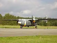 Un Noratlas aux couleurs de l'Armée de l'air française, au Salon du Bourget 2009. On distingue bien la configuration bipoutre, permettant un accès aisé aux portes de chargement arrière. | |