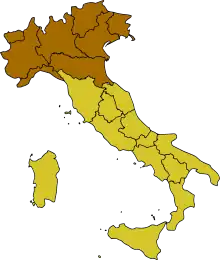 - le Nord-Ouest (Nord-Ouest), qui comprend les régions de la Vallée d'Aoste, parfois mais pas toujours de la Ligurie, la Lombardie et le Piémont ;
