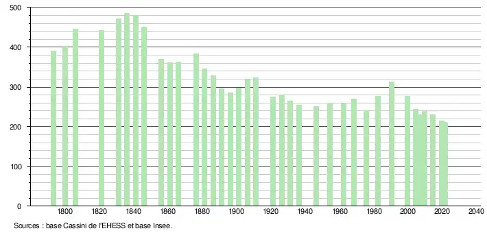 L'évolution du nombre d'habitants est connue à travers les recensements de la population effectués dans la commune depuis 1793. Pour les communes de moins de 10 000 habitants, une enquête de recensement portant sur toute la population est réalisée tous les cinq ans, les populations légales des années intermédiaires étant quant à elles estimées par interpolation ou extrapolation[22]. Pour la commune, le premier recensement exhaustif entrant dans le cadre du nouveau dispositif a été réalisé en 2004[23].