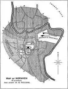 La communauté juive de Norwich est au Moyen Âge la deuxième du royaume. Venue de Rouen à partir de 1066 avec Guillaume le Conquérant, elle s’est établie majoritairement à Londres et à Norwich. En 1144, les Juifs de Norwich sont accusés d'avoir commis un sacrifice humain sur la personne de Guillaume de Norwich, retrouvé mort lardé de coups de couteau. Ce fut le premier cas d'accusation de crime rituel contre les Juifs en Angleterre. L'histoire a été transformée en un culte, William acquit le statut de martyr avant d'être canonisé. Le culte de saint Guillaume a attiré un grand nombre de pèlerins, enrichissant l'église locale. Le , tous les Juifs de Norwich sont massacrés à l'exception de quelques-uns qui trouvent refuge dans le château[2]. Un premier pogrom a lieu en 1144. Cependant, c’est après le départ de Richard Cœur de Lion pour la troisième croisade en 1190 que se serait déroulé le plus important pogrom[3]. Néanmoins, selon les historiens modernes, il n'y a aucune trace crédible d'un pogrom de 1190 à Norwich. Il n'existe qu'une seule mention du massacre de Norwich de 1190, « une seule référence ambiguë dans la chronique de Ralph de Diss » qui n'est pas considéré comme un parangon de la chronologie exacte[1].