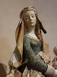 Elle porte sur une robe bleue, ajustée sur le haut du corps, un manteau blanc/gris au revers doré qui lui sert de voile, traité de manière naturaliste car la couleur cherchait à imiter le vair. Les motifs étoilés de sa robe ont disparu avec le temps. Dans quelques parties peu visibles de la bordure et de la doublure du manteau, la dorure a été remplacée par un alliage argent/or recouvert d'un glacis jaune, qui correspond à un souci d'économie selon une technique connue en Allemagne à la fin du Moyen Âge. L’or du galon supérieur de la robe, ainsi que sa couronne, devaient être rehaussés de perles ou de pierres du fait des percements réguliers que l’on peut y constater. Or, il n’y a aucune trace d’usure ou de frottement dû à la présence d’une pierre décorative quelconque. Aucun fragment d’un de ces matériaux ou même de rouille n’a été retrouvé pour le prouver ni aucune trace de colle. Pour l’encolure de la robe, il semblerait donc qu’il n’y ait jamais eu d’ornements. En revanche, pour la couronne, il y a tout de même l’hypothèse qu’un diadème était ajouté autour et attaché, les pierres venant s’insérer dans les trous sans y être bloquées.