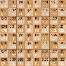 Dans les langues (par exemple en anglais, cf. figure ci-contre) où le numéro de la rangée est indiqué après le nom de la pièce qui définit la colonne, les noms de la pièce déplacée et de la colonne sont séparées par un tiret (-) s'il n'y a pas prise.