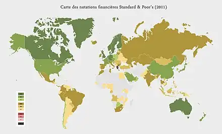 Les États (et d’autres collectivités publiques), tout comme les entreprises, peuvent être notés financièrement, qu’il s’agisse de pays développés (par exemple ceux de la zone euro) ou du tiers monde.