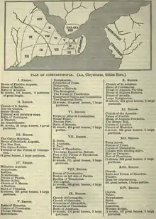 - Région III : l'hippodrome de Constantinople, le Nouveau Port (Kontoskalion), un bâtiment semi-circulaire appelé Sigma (près du Konstoskalion), le tribunal du forum de Constantin, quatre-vingt-quatorze « domus ».