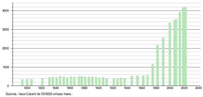 L'évolution du nombre d'habitants est connue à travers les recensements de la population effectués dans la commune depuis 1793. Pour les communes de moins de 10 000 habitants, une enquête de recensement portant sur toute la population est réalisée tous les cinq ans, les populations légales des années intermédiaires étant quant à elles estimées par interpolation ou extrapolation[31]. Pour la commune, le premier recensement exhaustif entrant dans le cadre du nouveau dispositif a été réalisé en 2008[32].