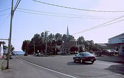 ![]() Vue sur l'intersection principale de Notre-Dame-du-Nord, au Témiscamingue. Le croisement correspond à la route 101 (appelée rue Principale Nord et Sud) et la rue Ontario, se prolongeant en autoroute 65 l'autre côté de la frontière de la province du même nom. En arrière-plan, on voit la limite nord du lac Témiscaming. |