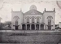 Le bâtiment de la synagogue en brique est construit sur un plan rectangulaire. Son élément le plus caractéristique est un dôme sphérique doré qui domine la ville. La façade frontale de la synagogue se divise en trois parties: la partie centrale en recul par rapport aux deux avancées latérales, reliées entre elles par une galerie servant de porche à l'entrée principale.