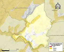 Le retrait-gonflement des sols argileux est susceptible d'engendrer des dommages importants aux bâtiments en cas d’alternance de périodes de sécheresse et de pluie. 15,6 % de la superficie communale est en aléa moyen ou fort (33,6 % au niveau départemental et 48,5 % au niveau national). Sur les 114 bâtiments dénombrés sur la commune en 2019, 3 sont en aléa moyen ou fort, soit 3 %, à comparer aux 25 % au niveau départemental et 54 % au niveau national. Une cartographie de l'exposition du territoire national au retrait gonflement des sols argileux est disponible sur le site du BRGM[17],[Carte 2].