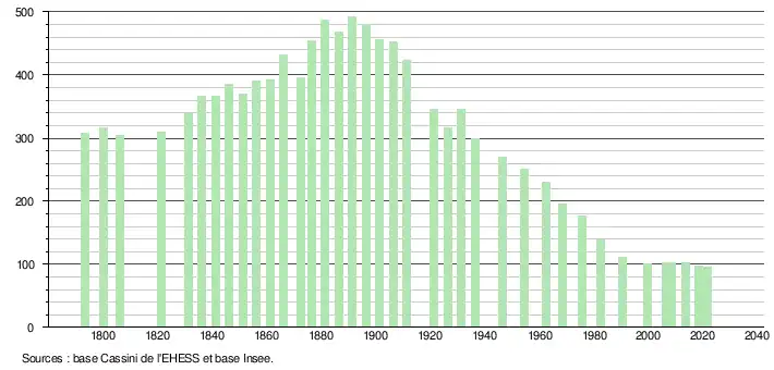 L'évolution du nombre d'habitants est connue à travers les recensements de la population effectués dans la commune depuis 1793. Pour les communes de moins de 10 000 habitants, une enquête de recensement portant sur toute la population est réalisée tous les cinq ans, les populations légales des années intermédiaires étant quant à elles estimées par interpolation ou extrapolation[20]. Pour la commune, le premier recensement exhaustif entrant dans le cadre du nouveau dispositif a été réalisé en 2008[21].