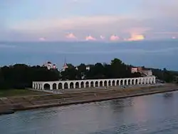Novgorod a été construite à l'endroit le plus étroit de la Volkhov, rivière émissaire du lac Ilmen. Le premier pont de Novgorod, le Grand pont, apparaît à cet endroit le plus étroit dès le Xe siècle, ce qui est prouvé par des recherches archéologiques[30]. Il permet de connecter les deux parties historiques de Novgord, la Detinets et la cour de Iaroslavl. Reconstruit à de multiples reprises, il est finalement détruit en 1944 lors de la libération par les Allemands[31].