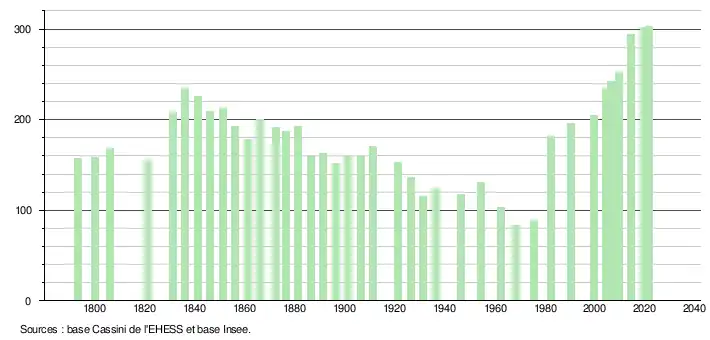 L'évolution du nombre d'habitants est connue à travers les recensements de la population effectués dans la commune depuis 1793. Pour les communes de moins de 10 000 habitants, une enquête de recensement portant sur toute la population est réalisée tous les cinq ans, les populations légales des années intermédiaires étant quant à elles estimées par interpolation ou extrapolation[15]. Pour la commune, le premier recensement exhaustif entrant dans le cadre du nouveau dispositif a été réalisé en 2004[16].