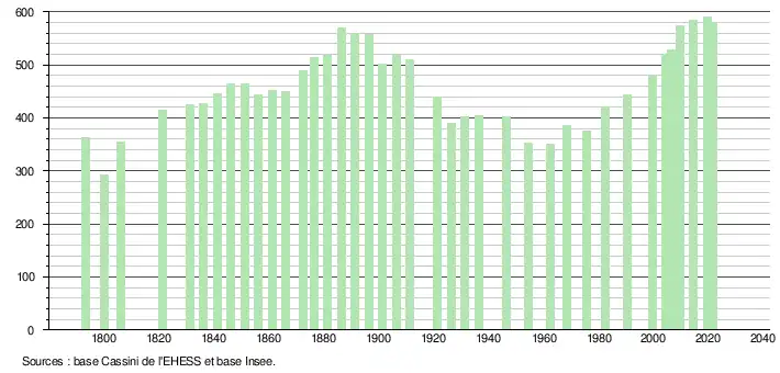 L'évolution du nombre d'habitants est connue à travers les recensements de la population effectués dans la commune depuis 1793. Pour les communes de moins de 10 000 habitants, une enquête de recensement portant sur toute la population est réalisée tous les cinq ans, les populations légales des années intermédiaires étant quant à elles estimées par interpolation ou extrapolation[27]. Pour la commune, le premier recensement exhaustif entrant dans le cadre du nouveau dispositif a été réalisé en 2004[28].