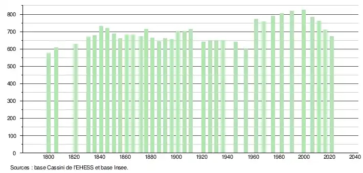 L'évolution du nombre d'habitants est connue à travers les recensements de la population effectués dans la commune depuis 1800. Pour les communes de moins de 10 000 habitants, une enquête de recensement portant sur toute la population est réalisée tous les cinq ans, les populations légales des années intermédiaires étant quant à elles estimées par interpolation ou extrapolation[18]. Pour la commune, le premier recensement exhaustif entrant dans le cadre du nouveau dispositif a été réalisé en 2006[19].