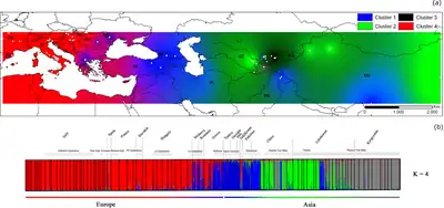 fig. 2, Structure des populations de 91 populations de noyers communs (Pollegioni[10], 2017). L’analyse de la structure génétique des populations corrobore la théorie d’une évolution séparée du noyer en quatre groupes principaux : trois centrés sur l’Asie (cluster 1 bleu, 2 noir, 3 vert), un localisé en Europe (cluster 4, en rouge). CN=Chine, UZ=Ouzbékistan, KG=Kirghizstan, TR=Turquie