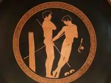 - Les Grecs. La Grèce est aussi connue pour un type de sculpture représentant un jeune homme isolé, debout et nu, le kouros. Une offrande aux dieux ou un monument funéraire représentant en général un jeune aristocrate, mais jamais sous forme de portrait. Les artisans grecs ont réalisé d'innombrables vases, dont un grand nombre de coupes (à boire le vin au cours des banquets) qui portent un décor peint avec des scènes de la vie quotidienne. Elles présentent souvent les jeunes athlètes au gymnase (en grec gymnasion [de gymnos : nu] qui désignait le lieu où l’on s’exerçait nu) suivant une tradition relativement récente - peut être vers la fin du VIe siècle[17]. D'autres coupes représentent le banquet avec, pour les plus anciennes, la nudité rituelle de la danse du komos (par des hommes) et, de tous temps, les plaisirs et les jeux sexuels (hommes, hommes et femmes) qui sont exposés, invitant les participants au banquet à faire de même. Ces plaisirs étaient montrés avec simplicité comme de purs moments de bonheur, pouvant légitimement être déposés dans une tombe, pour le défunt.