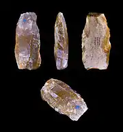 Le nucléus se trouve en bas à droite, les lames (face ventrale visible) au centre, les éclats de préparation du nucléus en haut à gauche et les tablettes de ravivage (préparations successives du plan de frappe) en haut à droite.